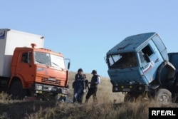 Алматы-Талдықорған күре жолында тұрған екі үлкен жүк көлігі Жовтистің сотына кетіп бара жатқан автокеруенге бөгет болды. 20 қазан 2009 жыл.